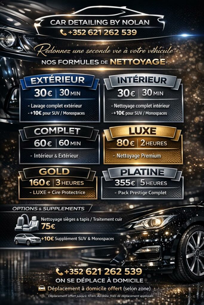 Prestation à domicile ou dans notre atelier. Nous préparons votre véhicule sur l’Axe Pétange – Differdange – Esch/Alzette – Dudelange. (Au delà, un forfait de 0.45€/km sera appliqué)