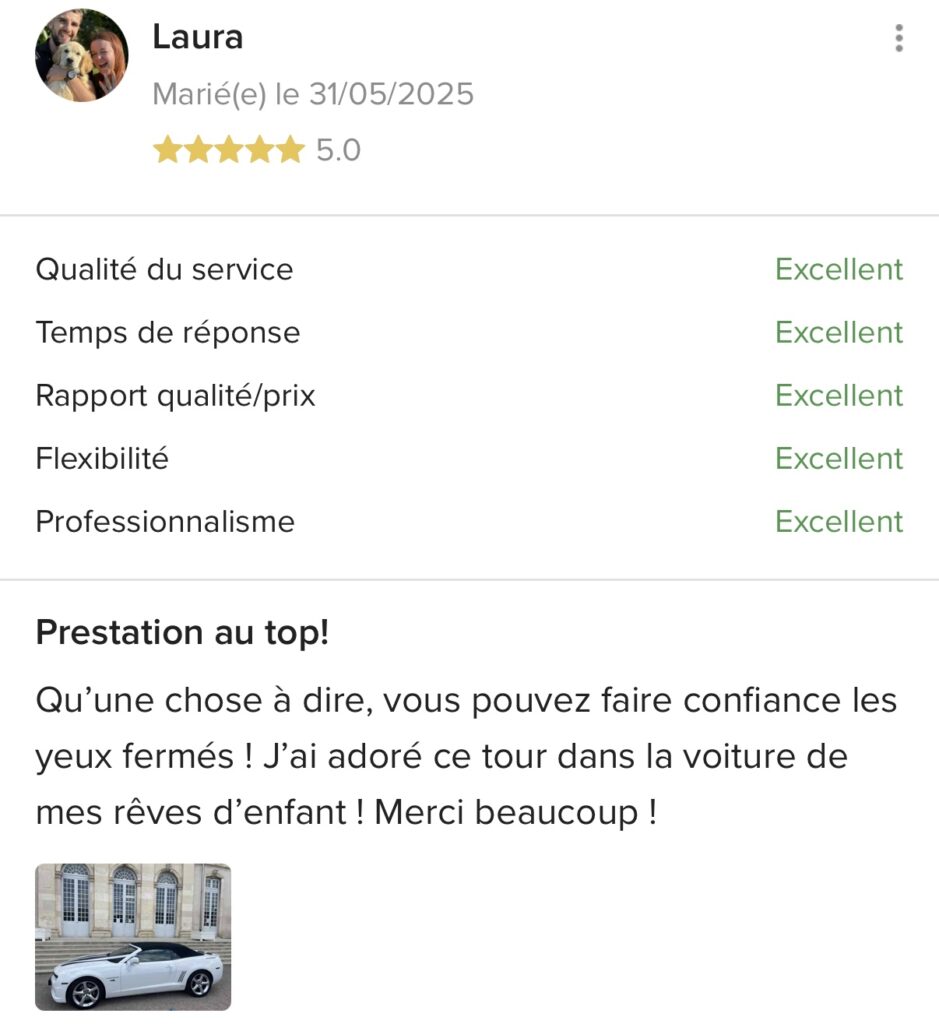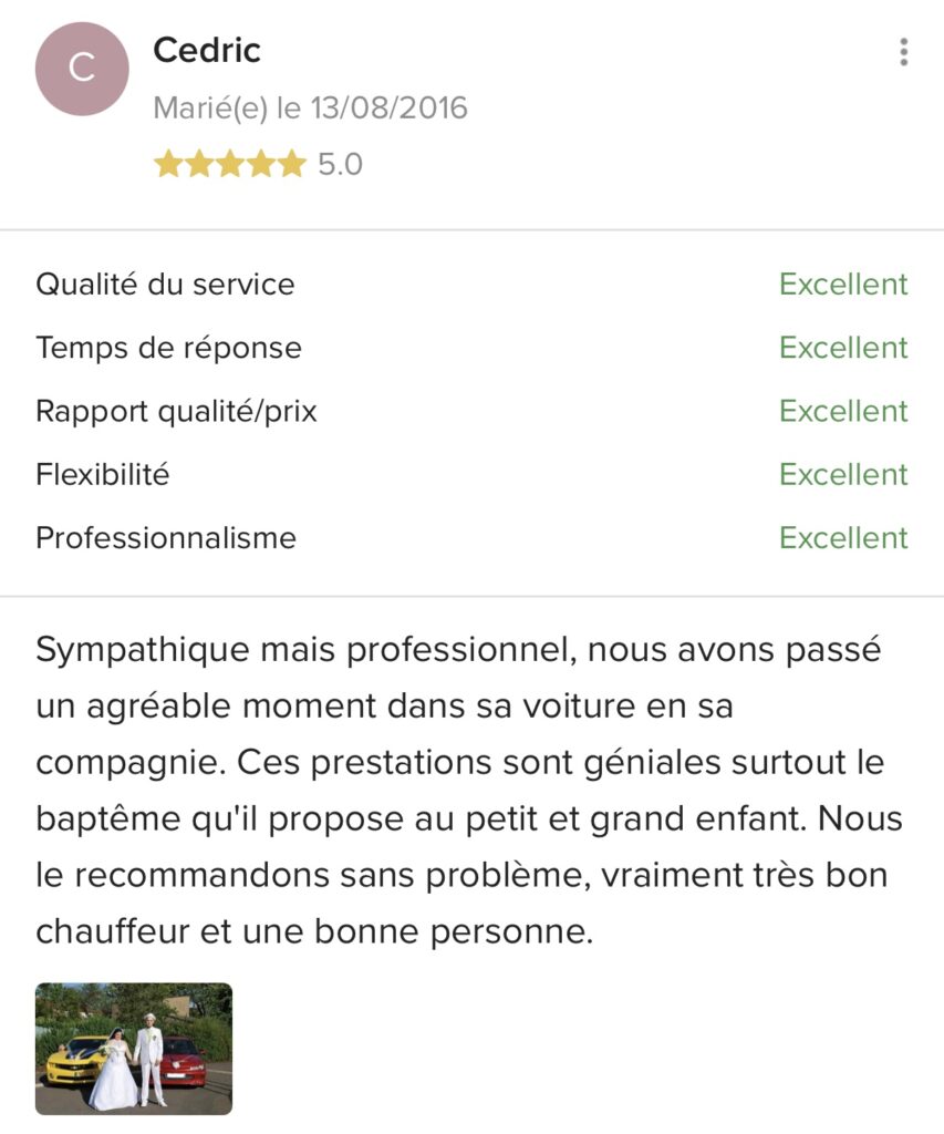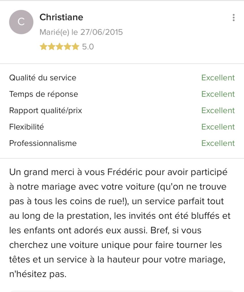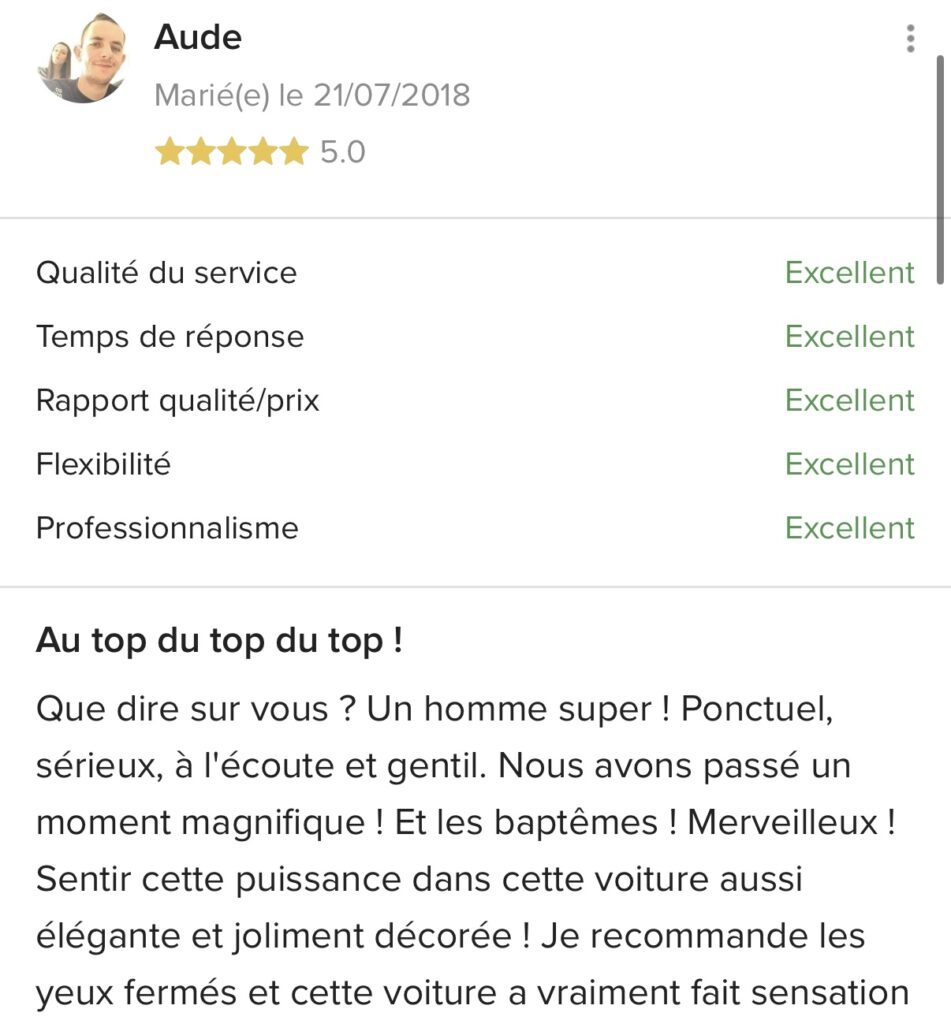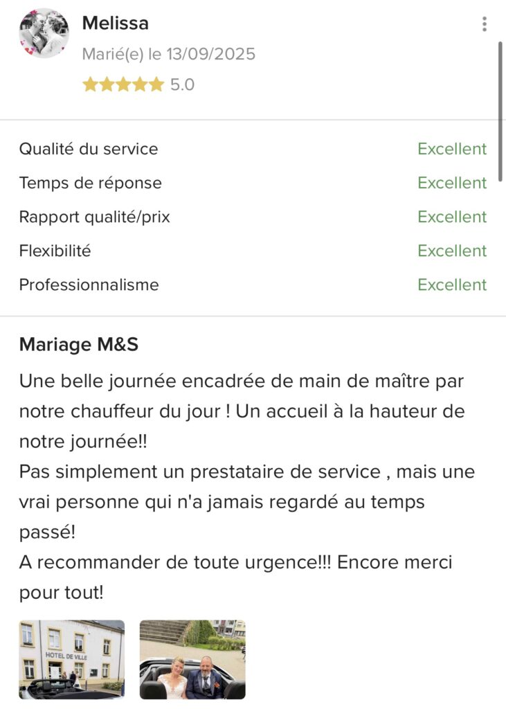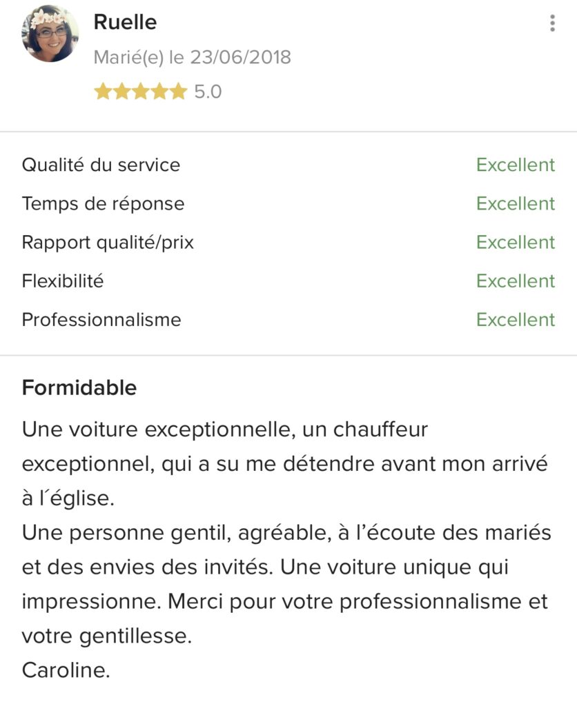 Nous allons chercher la mariée chez elle, nous l’emmenons à l’église, à la mairie, au vin d’honneur et aux photos. Forfait mariage 4 heures, 5 heures ou 7 heures
