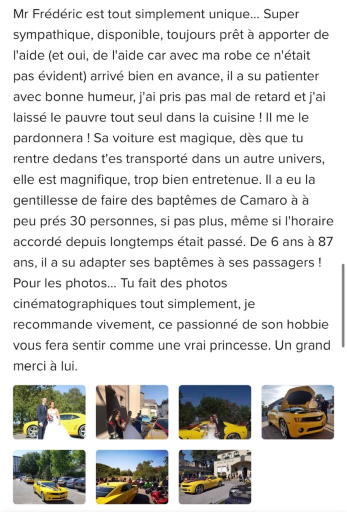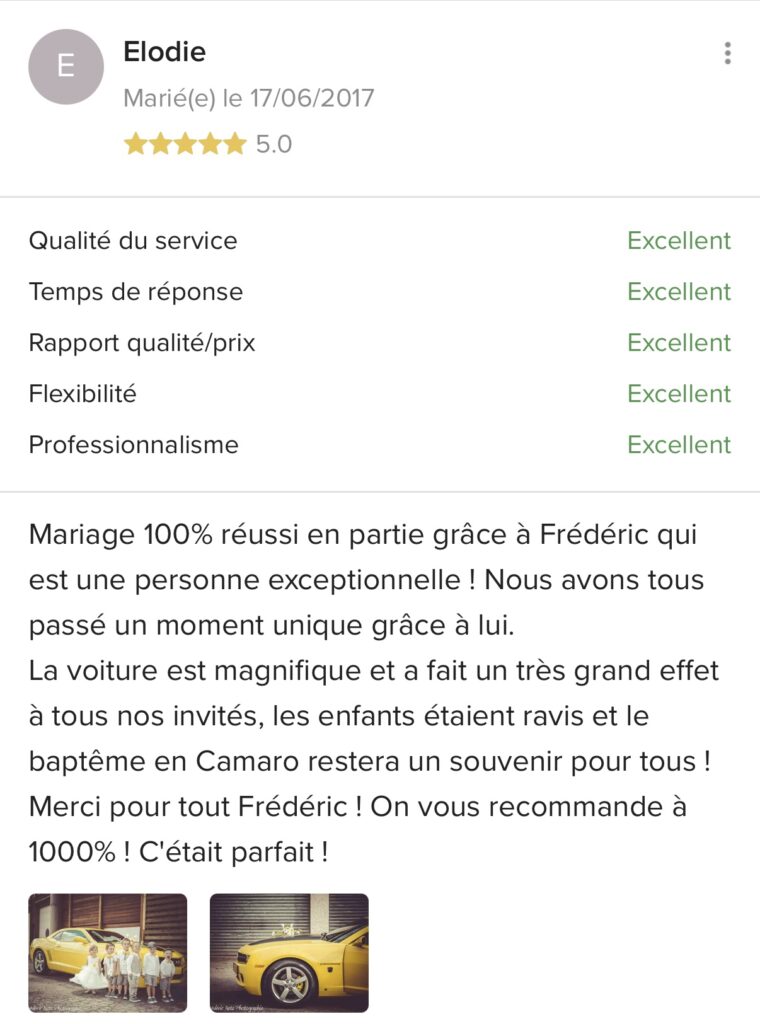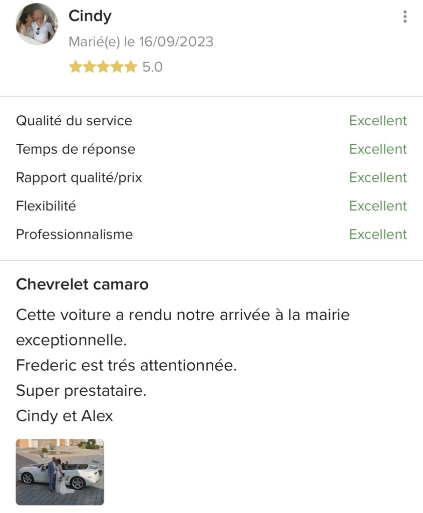 Votre mariage approche et vous ne vous êtes toujours pas décidés pour une entrée originale et inoubliable ? Arrivez à bord d’une voiture légendaire ! Location Voiture Mariage mettra à votre disposition sa Chevrolet Camaro jaune flamboyante ! Effet surprise garanti ! Votre jour J ne pourra débuter que de la meilleure façon qui soit ! Ou peut-être Opteriez vous pour le Cabriolet plus sobre en blanc doter du fabuleux V8 issue de la Corvette.